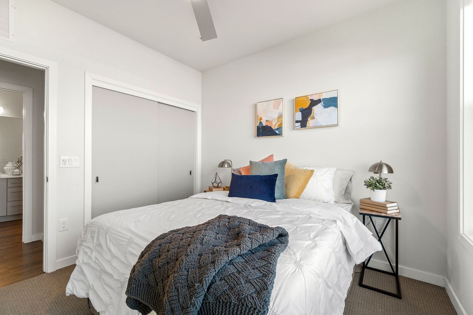 Average unit sizes exceed 940 square feet and unit interiors include quartz countertops and backsplashes, stainless steel appliances, barn doors, wood-style flooring, 9+ foot ceilings, built in custom storage, keypad entry, and built-in fiber optic service. Our B-1 floor-plan is a 2 bedroom unit with a flex office space, great for working from home. A rooftop deck offers 360-degree views of the Broncos Stadium at Mile High, downtown Denver, and the Rocky Mountains. Additional community amenities include a lobby with large windows, exposed concrete work, reclaimed wood, and a private package system area.