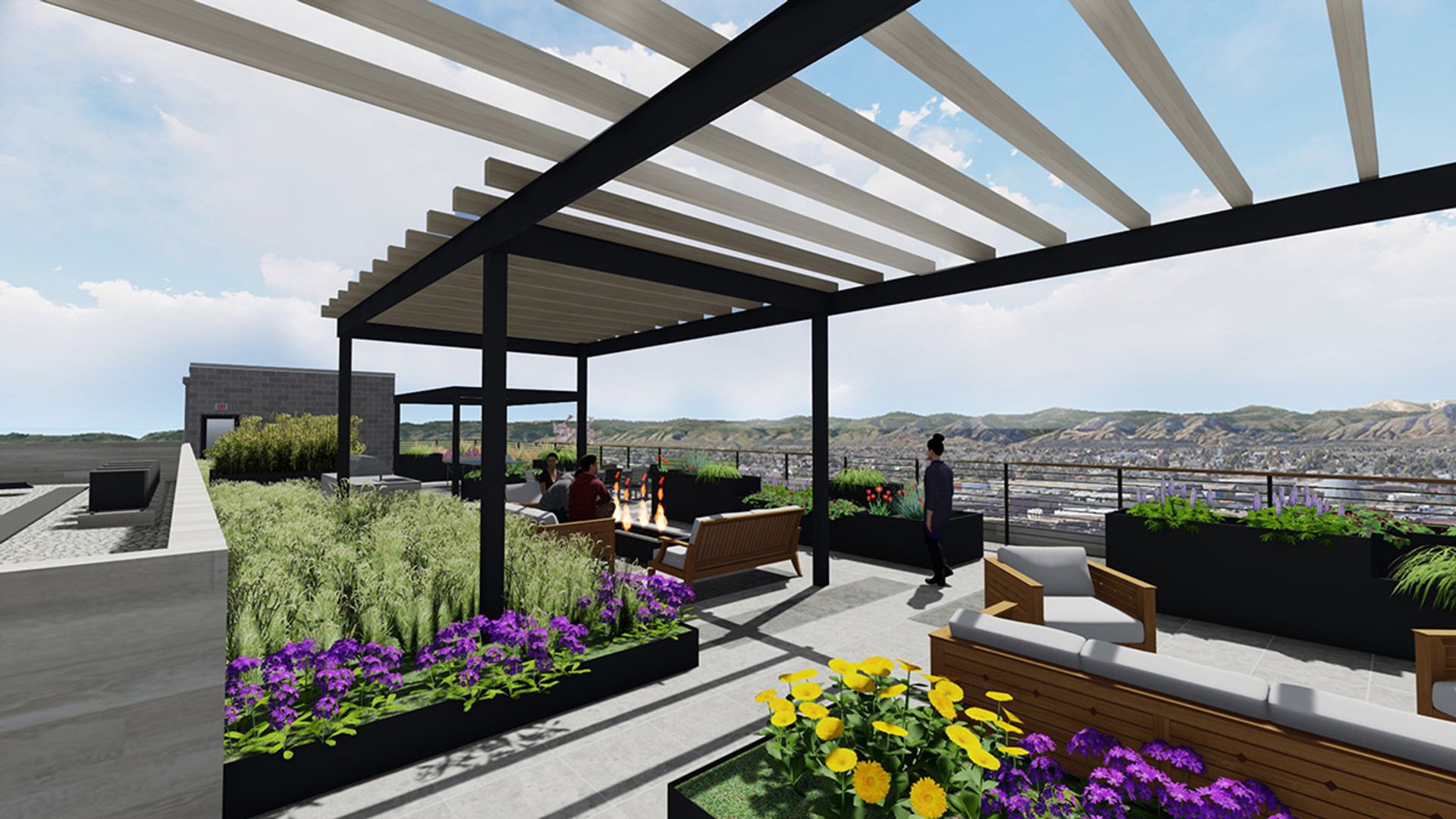Life at Tula extends beyond your front door. Head upstairs to the rooftop terrace and take in panoramic 360-degree views of the Denver skyline and Rocky Mountains. Gather with friends around the fire pit, grill dinner in the outdoor kitchen, relax while your pets explore the pet area, or simply enjoy the open sky above. A large solar array reflects Tula’s commitment to mindful, sustainable living. Residents have access to an on-site fitness center, plus garage and surface parking options for added convenience.