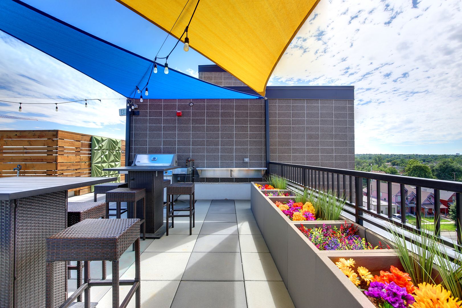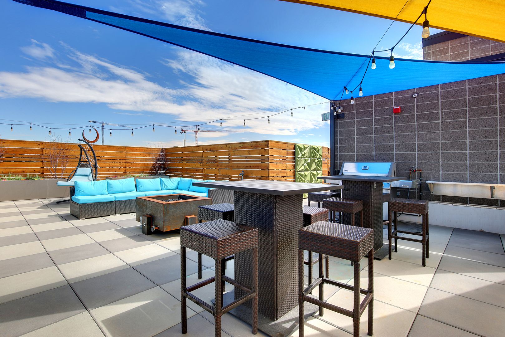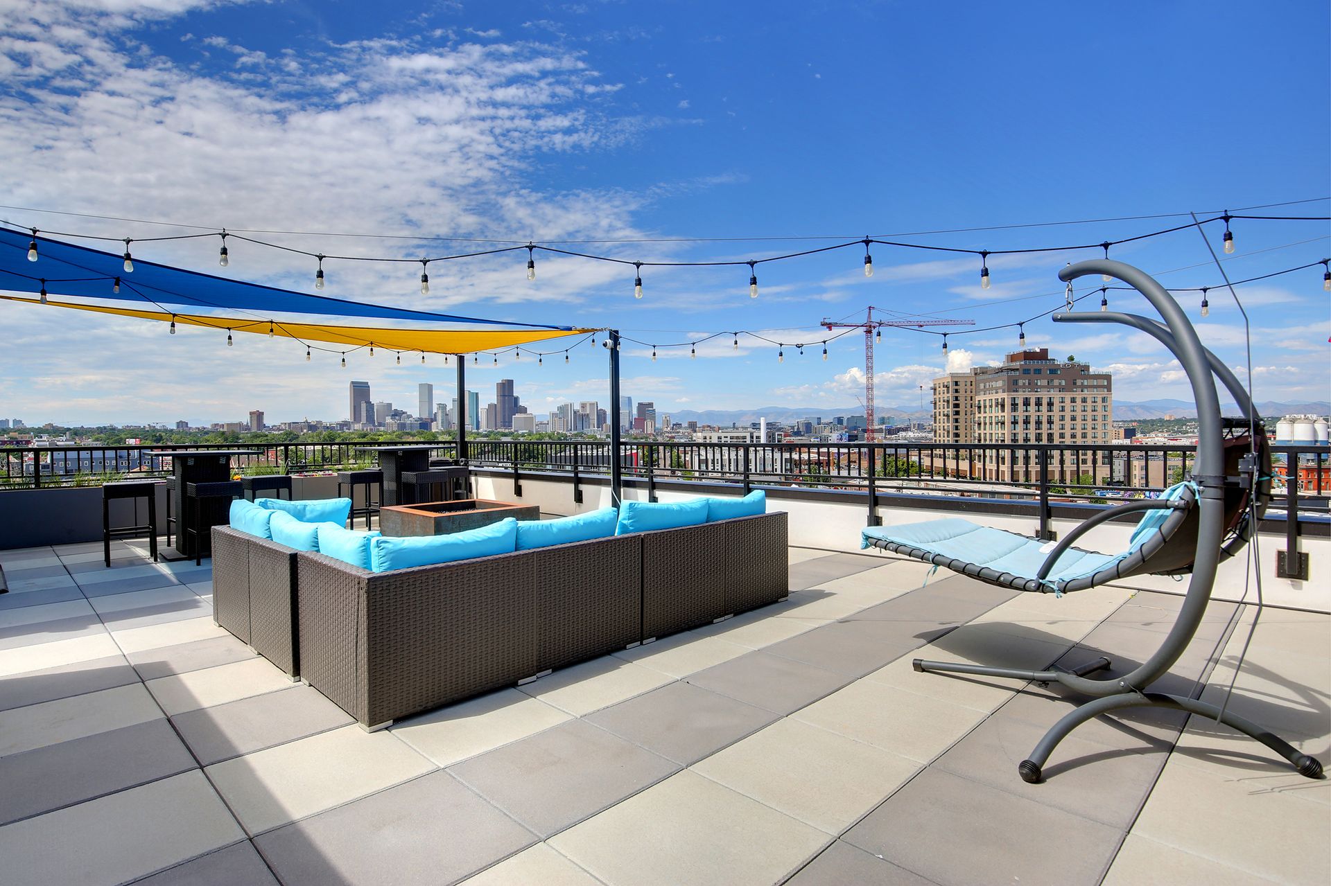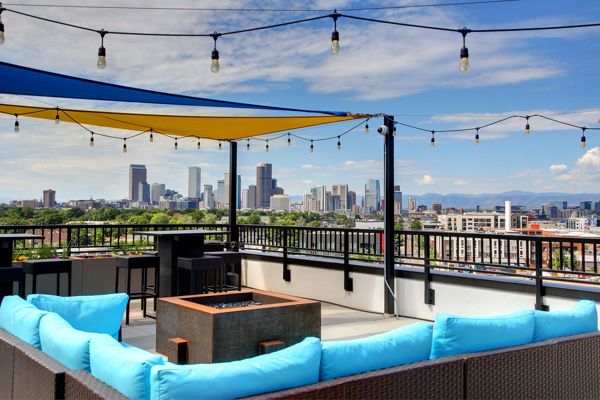 Bask in the Colorado sun on your rooftop patio with elevator access featuring a gas fire pit, gas BBQ for evening meals, colorful awnings, art sculptures, and plenty of space for lawn games with friends. Also available is an electric car charging station, secure bike storage, pet relief area, additional storage space, and package concierge in the secured lobby. Plenty of reserved parking spots available, but supplies are limited.
